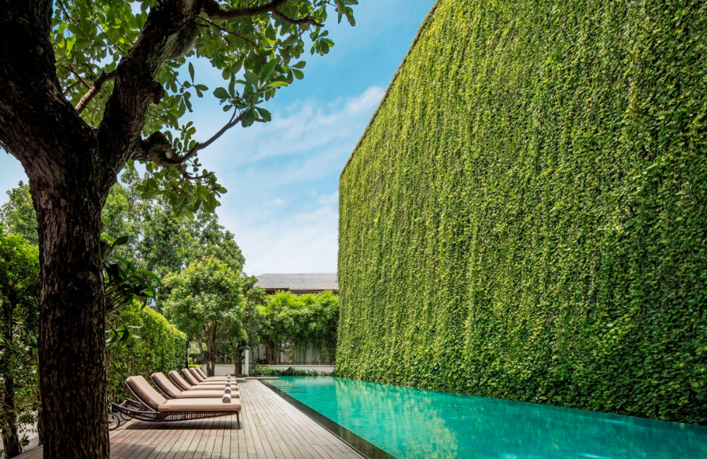 Echoing the ethos of eco-consciousness, the landscaping and trees that have stood tall since the days of the Trading Company, offer solace under the Thai sun, while a living wall envelops the 25-meter infinity pool, shrouding it in seclusion from the urban bustle beyond.