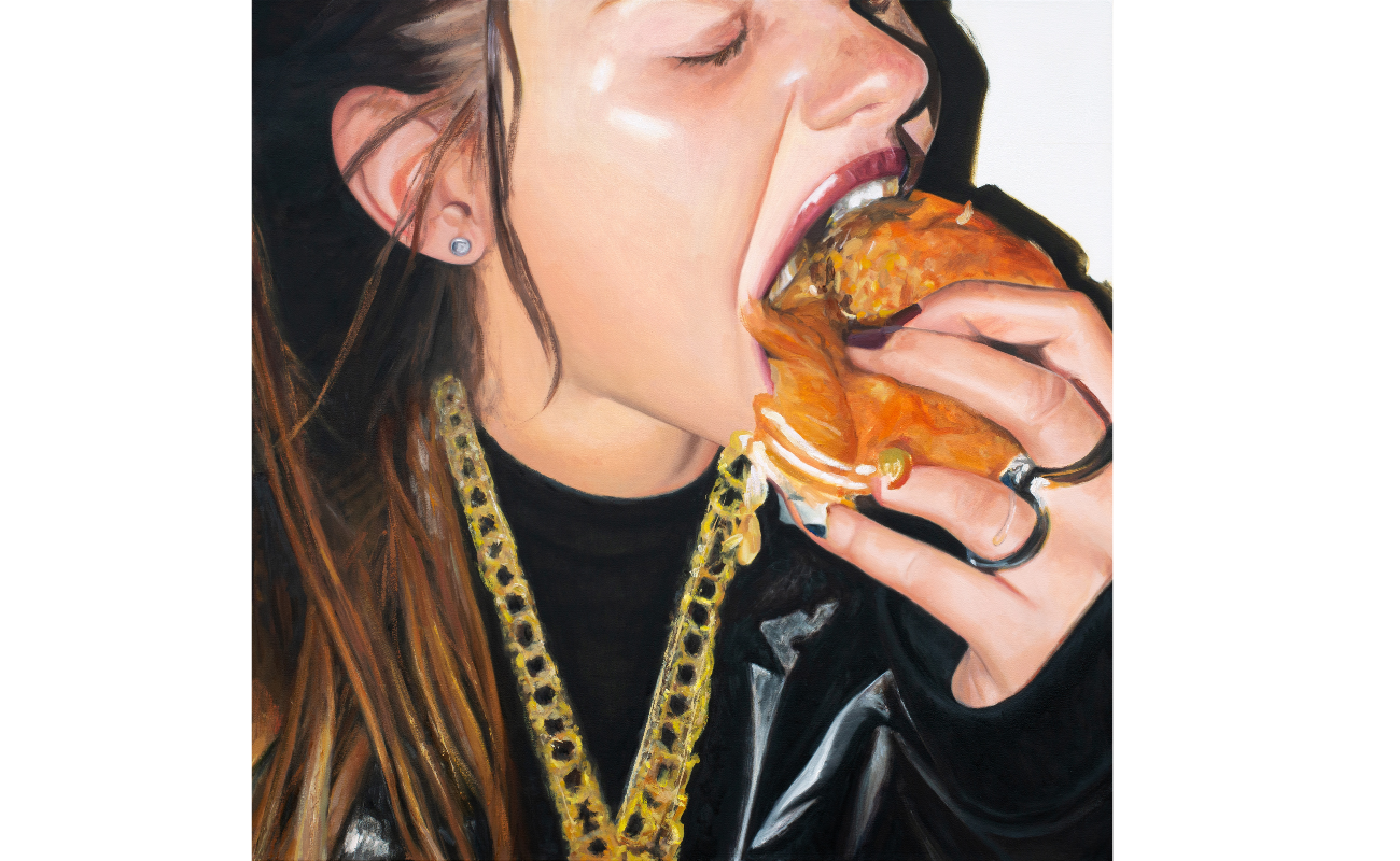 Abi Huxtable, A gen z woman messily eating a hamburger. She is wearing a chunky gold necklace and a shiny black puffer jacket on a white background, 2023, oil on canvas, 76.2 x 76.2 cm