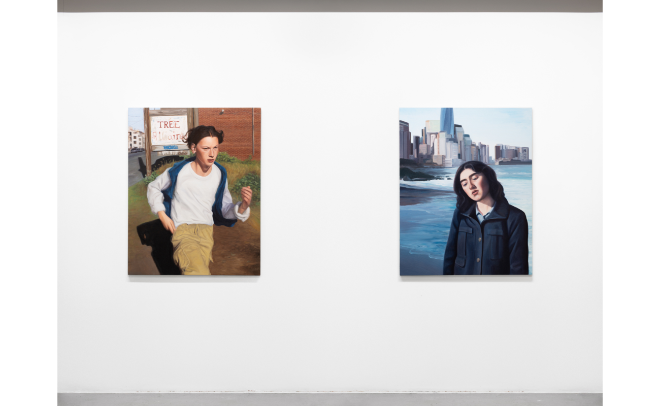 Abi Huxtable, Left: Rerun, 2026, oil on canvas, 96.5 x 76.2 cm; Right: A gen Z female working on a laptop in a cafe (remove background, Generative Fill, no prompt), 2025, oil on canvas, 96.5 x 76.2 cm