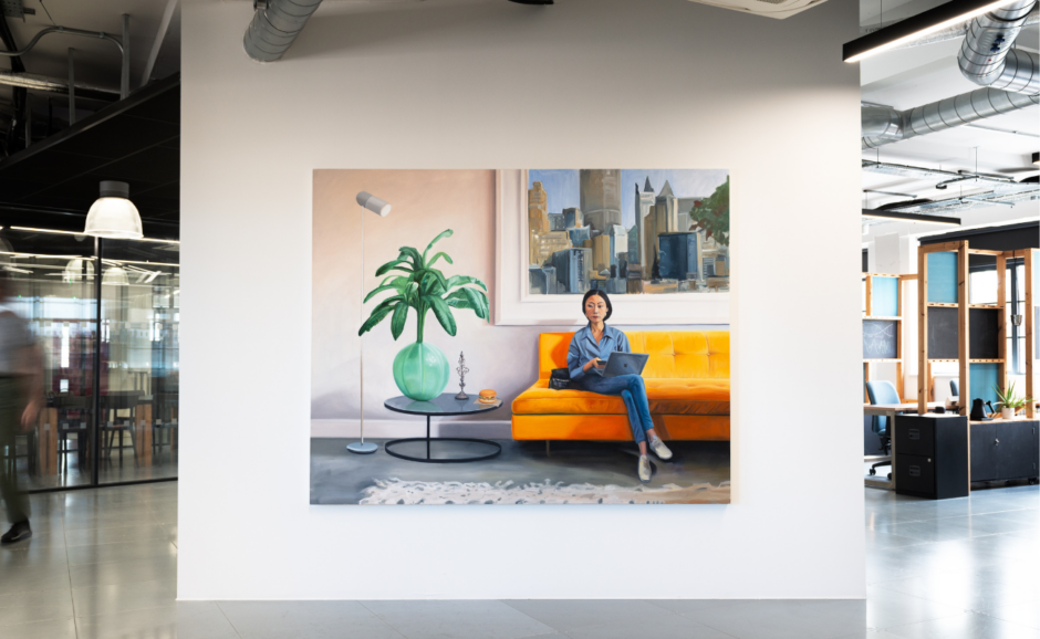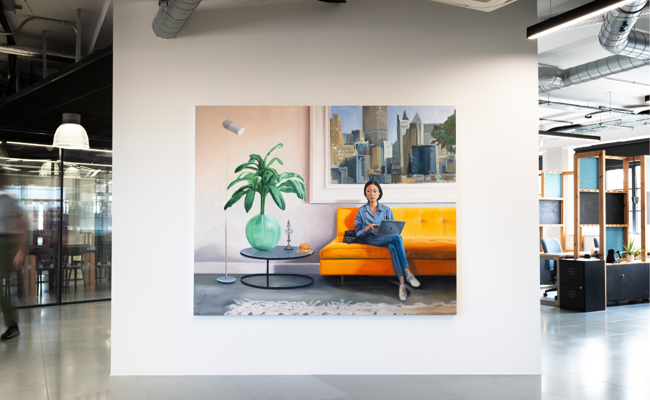 Top Image: Abi Huxtable, 3/4 view of Taiwanese, gen z, digital nomad, female, sitting on a modern sofa. (Inflatable houseplant), (Taiwanese ornament), (generic ornament), (hamburger), (what would utopia look like?), 2024, oil on canvas, 160 x 200 cm. Installation view, Creative Works, London