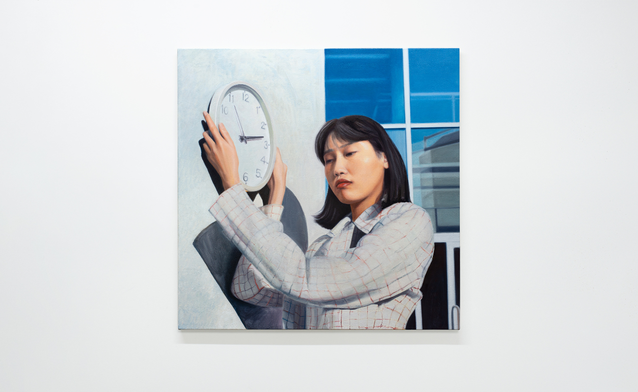 Abi Huxtable, A female gen Z digital nomad wearing millennial fashion, changing the time on a 3D printed clock, 2024, oil on canvas, 76.2 x 76.2 cm
