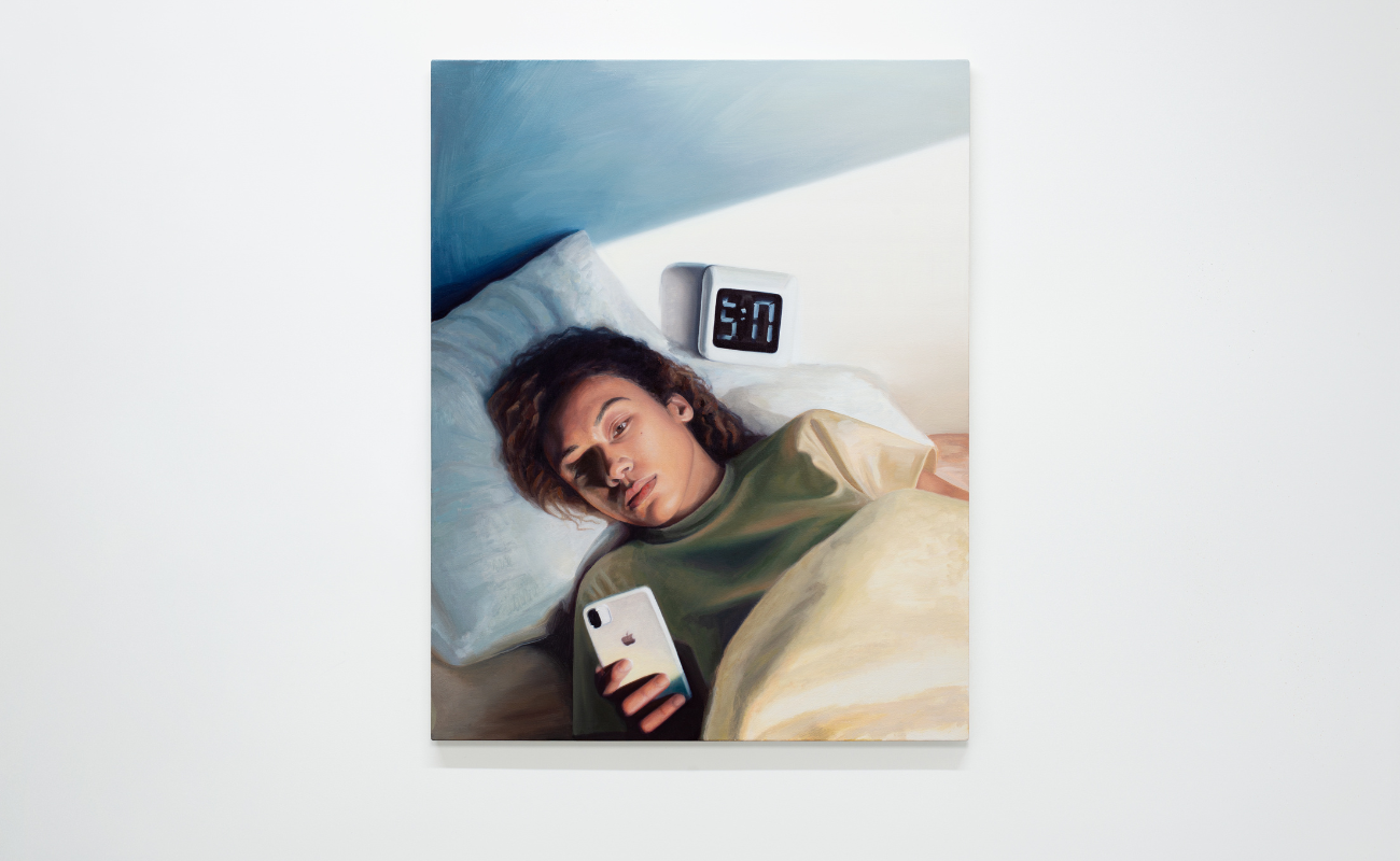 Abi Huxtable, Screen Time (Gen Z person waking up in bed, looking at their iPhone. Time is 5:59 on Groundhog Day alarm clock [Panasonic-RC 7025]), 2025, oil on canvas, 96.5 x 76.2 cm