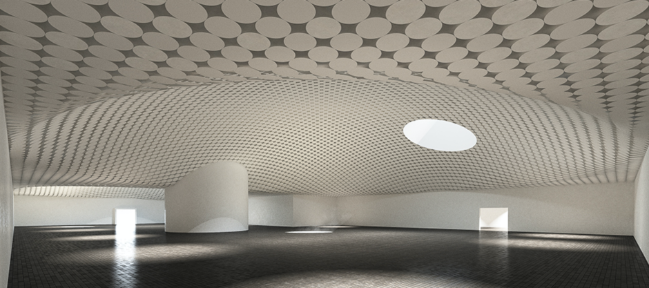 The roof of the new gallery is formed by a series of domes with angled rooflights that frame views of the surrounding area and allow exhibitions to be lit with natural light if the curators choose. The shape of the domes is expressed in the topography of the newly landscaped public square which sits above the galleries, as a series of gently rolling forms clad in concrete tiles.