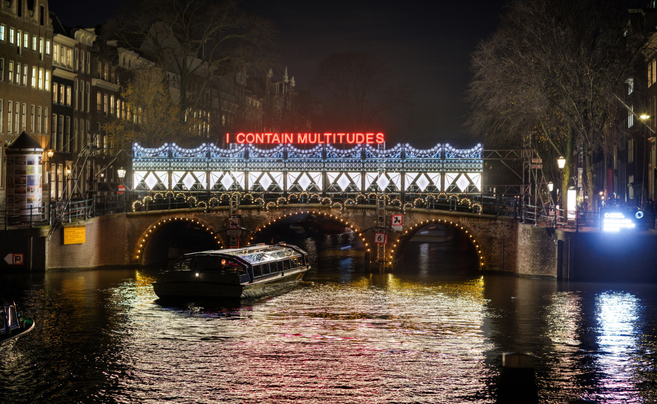 On board, I spoke with artists Jess Mae and Ali Tanucer, the collaborators behind Rhapsōidia. Developed by a multidisciplinary team from M Moser Associates, it is their most public engagement in Amsterdam’s winter arts calendar to date and blurs architecture, communication and participatory art. Mae described light as a way of exposing emotional residue; what cities remember and what they suppress. Tanucer noted that Amsterdam’s water, architecture and passers-by complete each work. Legacy, here, is not fixed; rather, it is negotiated daily.