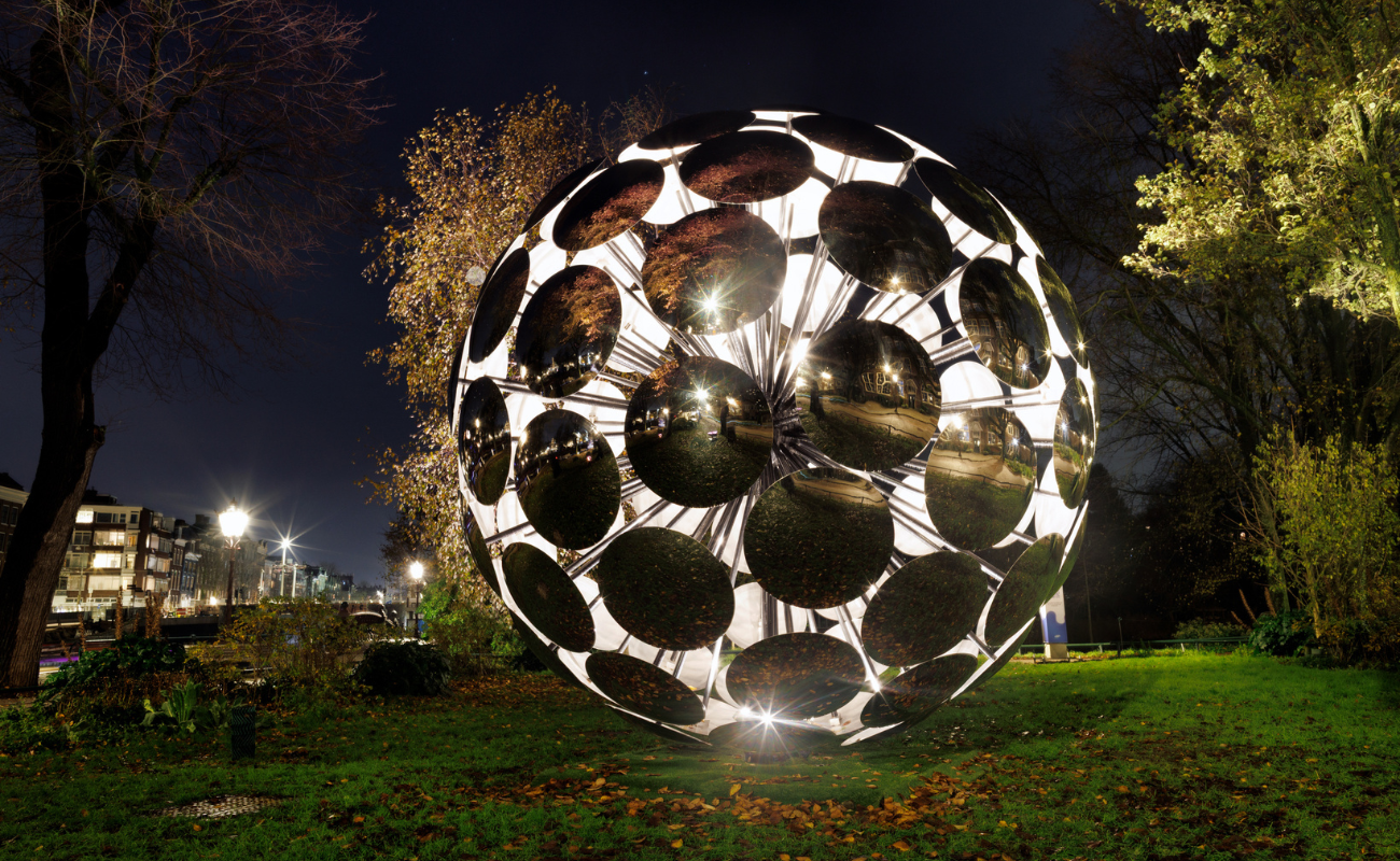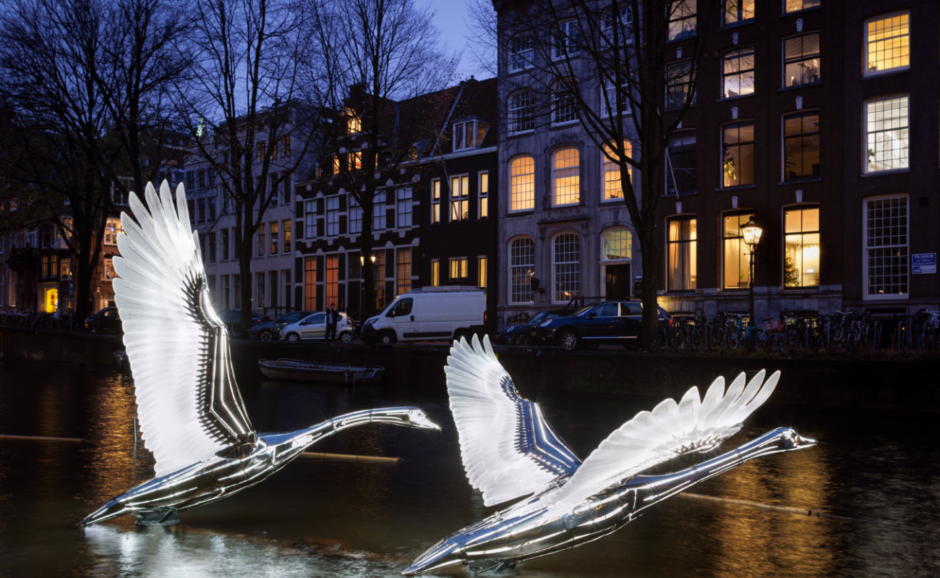 My first night in the city coincided with the opening of the 14th edition of Amsterdam Light Festival (until 18.1.26). After a champagne reception on solid ground, a group of wobbly visitors boarded a small canal boat and glided by the showcase, which had the theme of ‘Legacy’. If you’ve never witnessed this, it is less Regent Street, more Luciafest Kayak Parade in Denmark. Not at all festive, the broad theme has been interpreted by 20 international artists who have created an immersive show which can be witnessed across bridges, on warehouse walls and along the canal paths.
