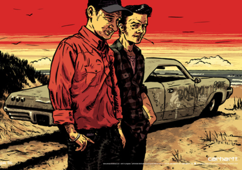 His bump and grind style is reminiscent of pulp fiction covers and cult film posters of the 1950s with a distinct contemporary,politically incorrect edge. The best kind of pop art, the kind that’s smiling at you with a knife behind it’s back.