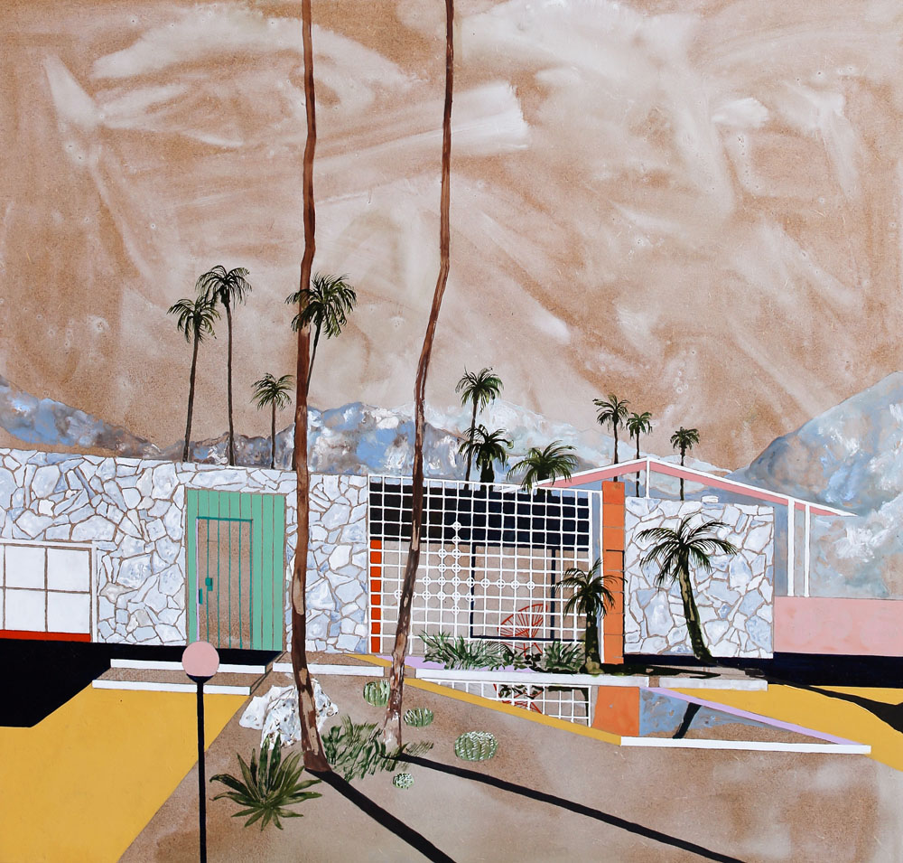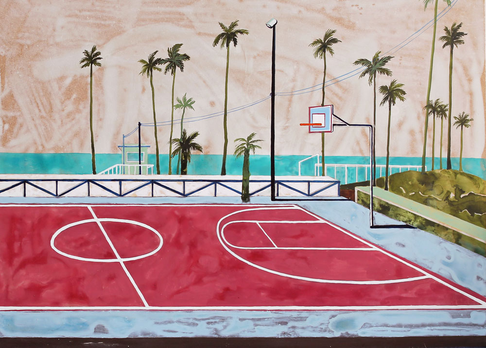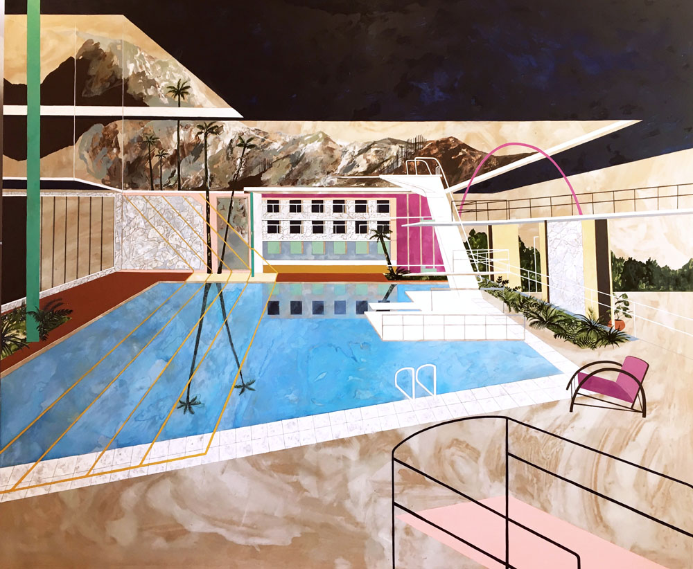 In Keates’s extensive lexicon, we find basketball courts on tropical sea-front esplanades, modernist museums with joyful mosaic façades, observatories based up in the clouds, luxurious swimming pools and private lidos, informal suburban domestic backyards and eerie institutional complexes like empty schools or office blocks. The prevalence of palm trees in Keates’s recent works perhaps comes as no surprise when it is discovered that in summer 2016 she went on a three-month research trip the USA, starting in New York and travelling down the East Coast, before working her way from Palm Springs and Los Angeles right up the West Coast and into Canada. The countless stopping points on this epic road-trip provided her with great swathes of new source material, from mid-century modernism to snow-capped mountain scenery, adding to the sense that we as viewers are privy to the artist’s own architectural odyssey. Endlessly inventive and with a remarkable eye for colour, composition, perspective, pattern and detail, Keates invites us to join her on her ongoing quest to explore the possibilities of the built environment and its place within the natural world.