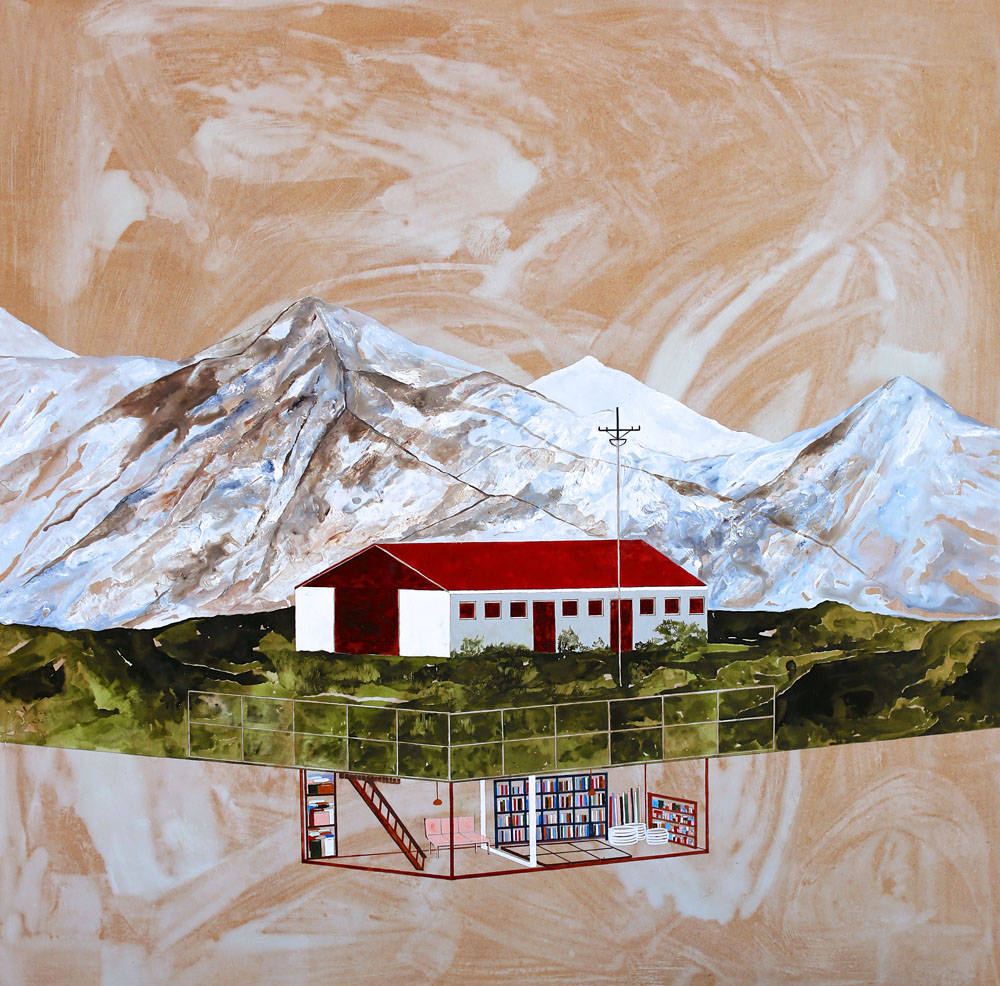 That humankind, especially mankind, is managing to upset the balance of the natural world, however, is alluded to by Keates in a work like As Glaciers Melt, which shows a beach hut or chalet accompanied by a simple jetty beside a turquoise sea, with a golden sandy shore and green hills for a backdrop. Behind them only snowy mountains and empty sky. The tacit implication is that as the ice melts, warmer weather comes and the water levels rise. While we might enjoy the warmer climate, it is ultimately bad news for everyone. That Keates is more than aware of our capacity to destroy the natural world completely, though, can be seen in Under the Surface, which depicts a single-storey building in the middle of a green craggy field against a barely snow-covered mountain range. As if in an architect’s drawing, the artist shows us a cut-away view of what’s going on underground. Beneath the building there is a deep basement, which at first appears like a pleasant living space with books, pouffes and a sofa. But, as Keates explains, what is depicted is a purpose-built nuclear bunker filled with tins, cans and bottles to allow its inhabitants to survive for a period of six months in the event of nuclear war. Above ground, we would have no idea of what lies beneath – we can’t even be sure what kind of building it is – whether residential, commercial or light industrial. What appears a quiet, innocuous landscape scene is revealed by the artist as a site of extreme planning for disaster, apocalypse and Armageddon.