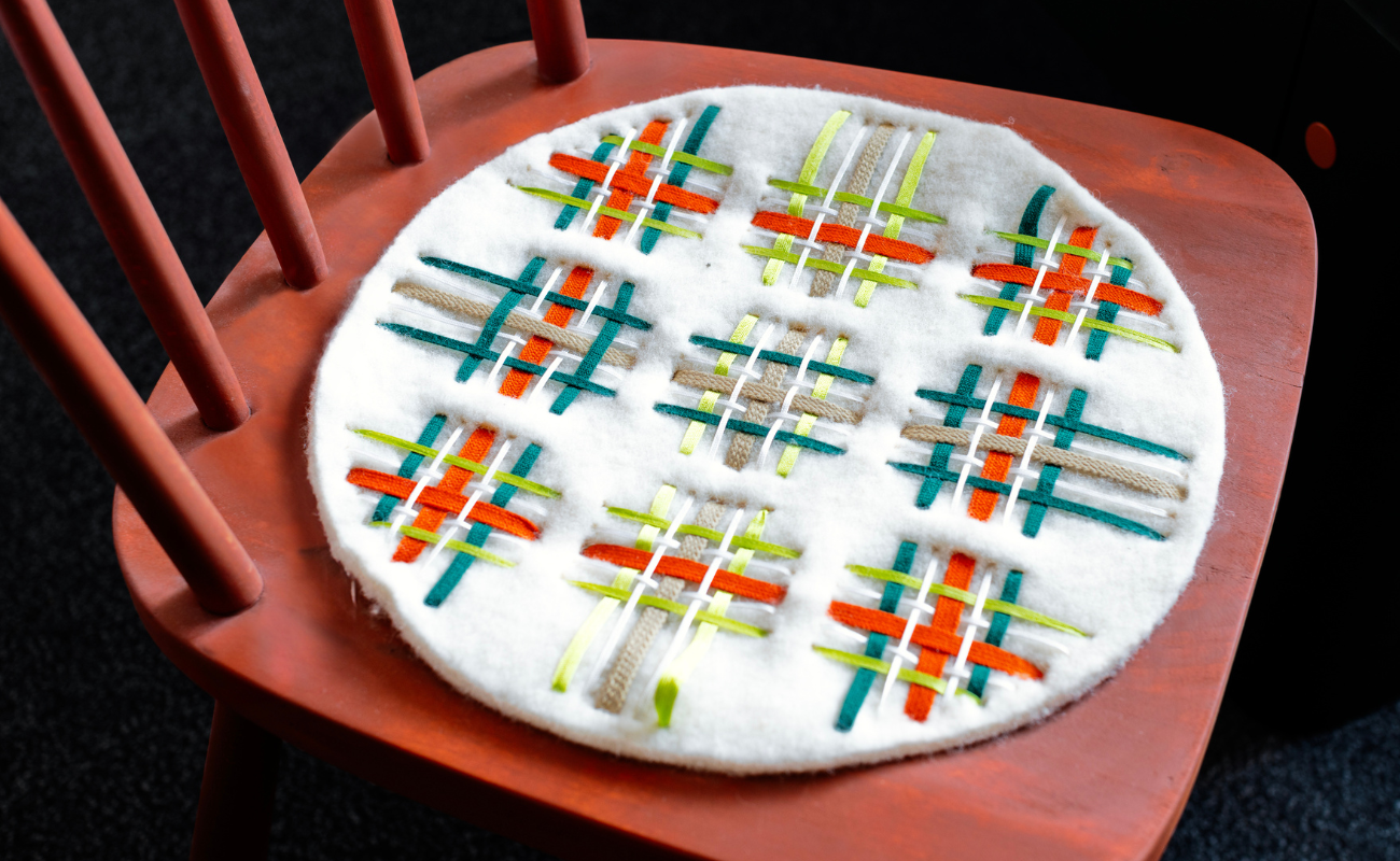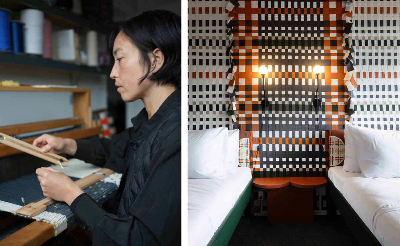 Lewis draws on contemporary interpretations of traditional Japanese weaving, translating heritage craft into something quietly radical. Surplus and second quality Sunbrella textiles are laser cut into strips, then hand woven into expansive wall tapestries that wrap the room in soft, fluid shifts of colour. The effect is tactile and calming, closer to stepping inside a textile landscape than checking into a hotel room. Sustainability here is not an aesthetic add on but the engine of the design itself. The weave is modular by nature, adapting to whatever surplus fabric is available, allowing waste streams to dictate new compositions rather than limiting them.