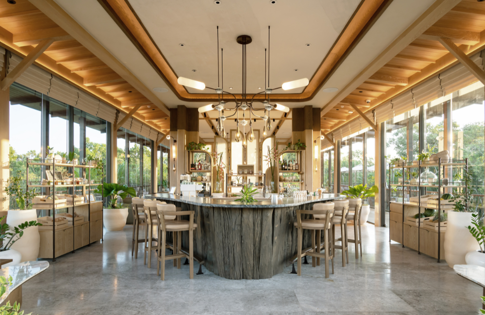 The restaurant, set within the farm, is a stylish, bright, and airy space that includes a bar, cafe and dining area. The food is served in beautifully designed, intricately delicate presentations, offering a feast for the eyes and the palate.