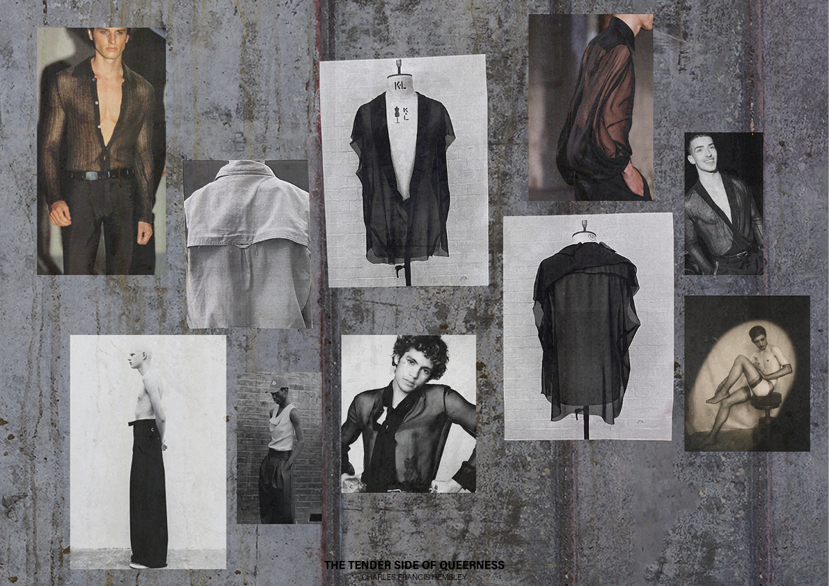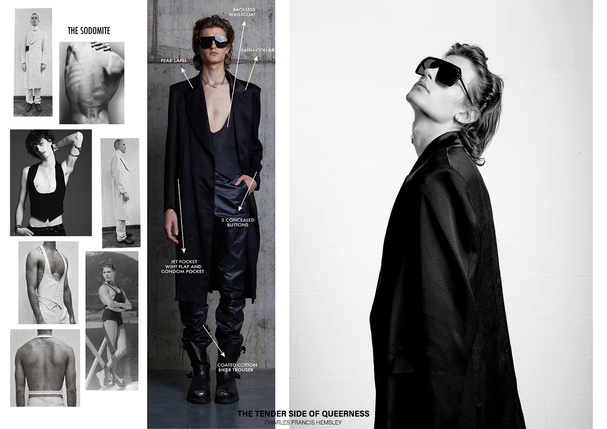 ‘I wanted to create something which expresses the inner strength and vulnerability that comes with embracing one’s sexual identity, while at the same time make men feel empowered and want to wear clothing with non-traditional masculine detailing, such as open-back tops.’