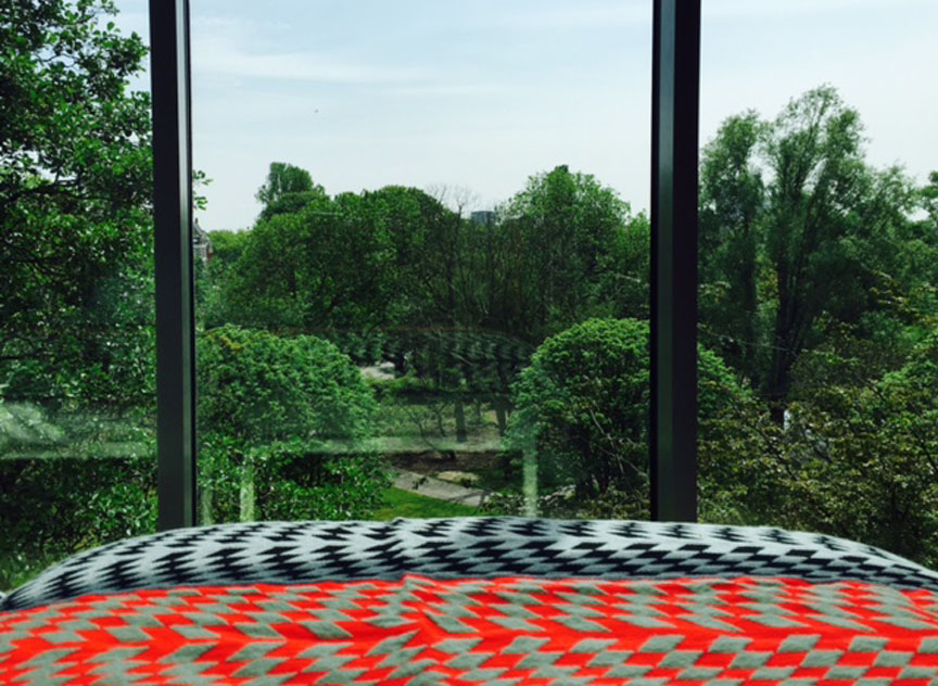 Our room is a corner twin on the third floor that has floor to ceiling windows and a pretty sweet view of the pretty Oosterpark. We can watch the joggers and smug exercisers go about their weekend fitness regime at our desk or while sat on one of the scandi design style chairs. Or gaze from the bed wrapped in a nice black and white throw with a splash of orange fluoro.