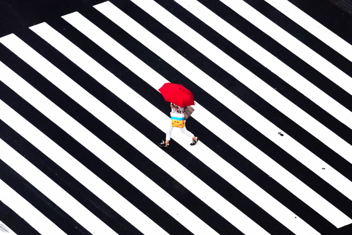The monochromatic rhythm of the wet tarmac and road paint is interrupted by people dressed in brightly coloured clothes or passing traffic. The images are vibrant snapshots of life on a grey day that are carefully composed to preserve each individual’s anonymity. “Even the most mundane details such as wet ground and rain drops can reveal a whole new world to us if we observe them from a slightly different angle,” says Yoshinori. “Rain is one of my continuing attempts to present a new perspective and interpretation towards our often overlooked daily phenomena.”