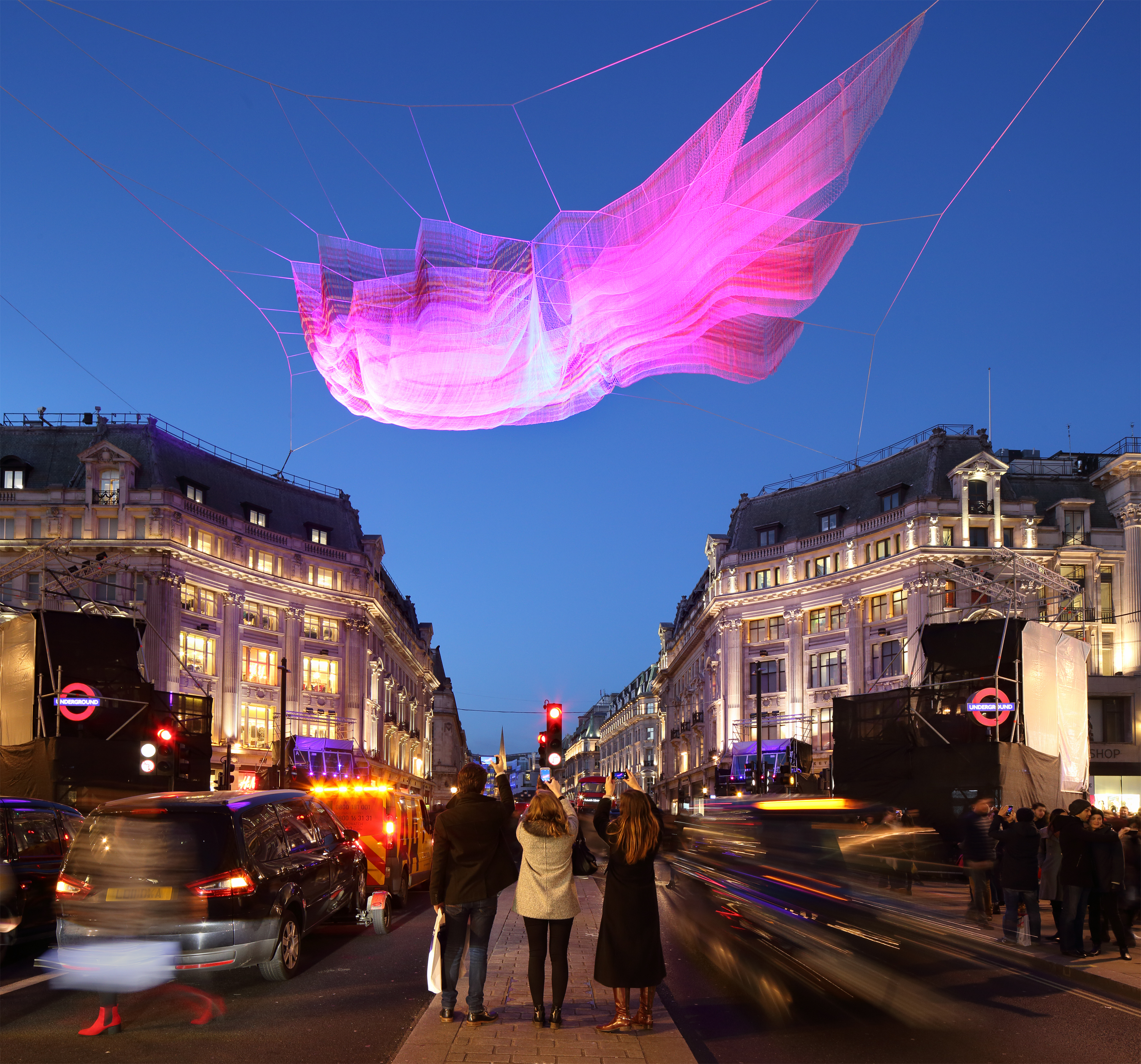 Artist Janet Echelman’s work traverses the boundaries of Sculpture, Architecture, Urban Design, Material Science, Structural and Aeronautical Engineering and Computer Science. She creates experiential sculpture at the scale of buildings that transform with wind and light. The art shifts from being an object to look at, to a living environment you can get lost in.