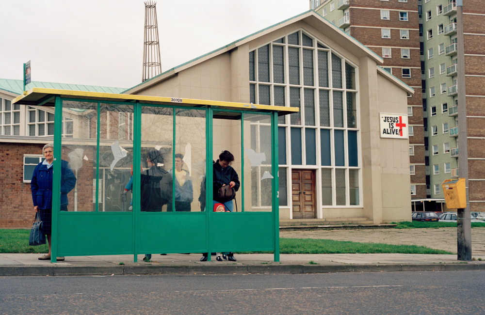 Robert Clayton, currently touring his work in Pitt’s Southbank centre exhibition, began searching for a place to capture on camera on a drive around his homelands of the West Midlands and later turned his photographs into a book, about the Lion Farm Estate, simply titled Estate. It features a collection of photos of a place by the book’s title: high and low rise flats in Oldbury in the heart of Birmingham’s post-industrial wastelands. A picture of a church by a bus stop here is compelling. The estate was built when they built council estates with tower blocks, high rises, low rises, even bungalows for access – a row of shops, youth clubs, a church and bus links. Everything was built for the community, like a primary school and care home, says Clayton: “from cradle to grave everything was built for working class people.” It’s a place Clayton remembers with deep warmth which has now come of age.