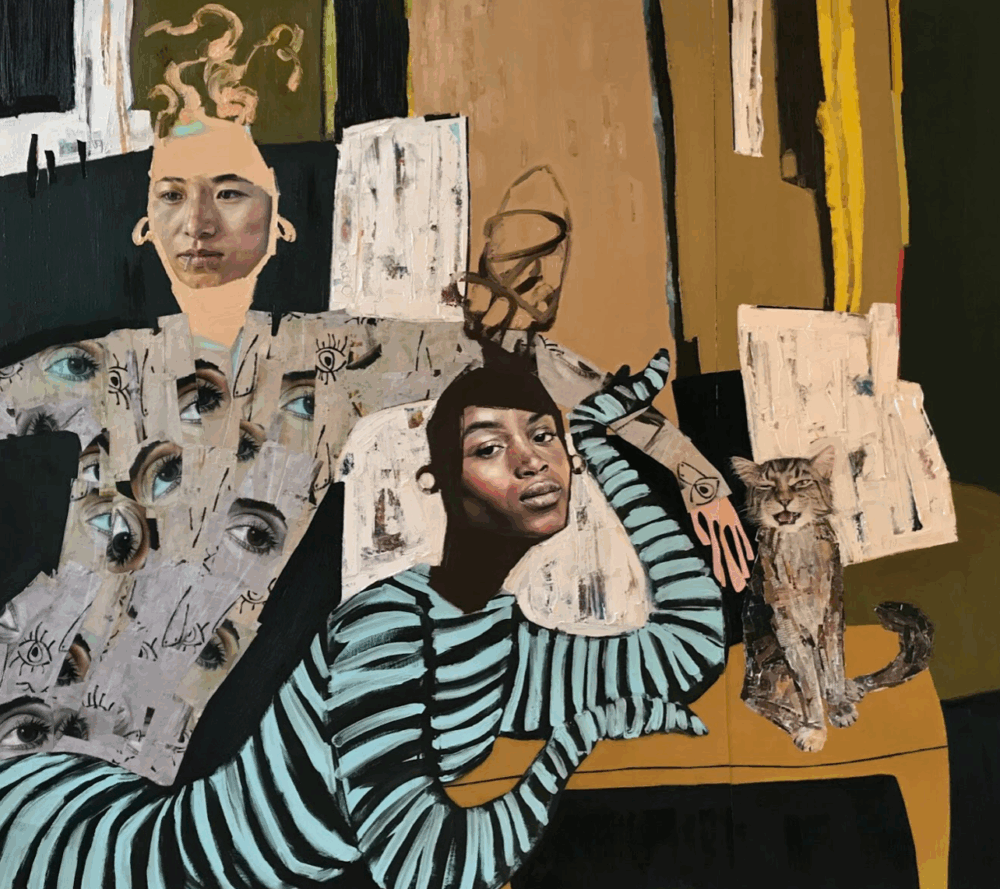 Despite the emotional weight of her subjects, Howard’s work is never one-note. Abstract marks, unexpected animals, and whimsical props frequently appear as visual counterpoints. “A bit of toil, mixed with flashes of joy — that’s life,” she says. “And I like my paintings to reflect that.”