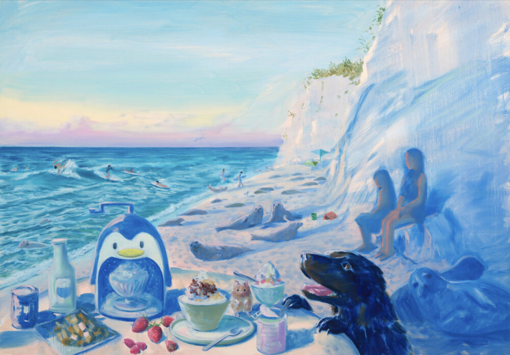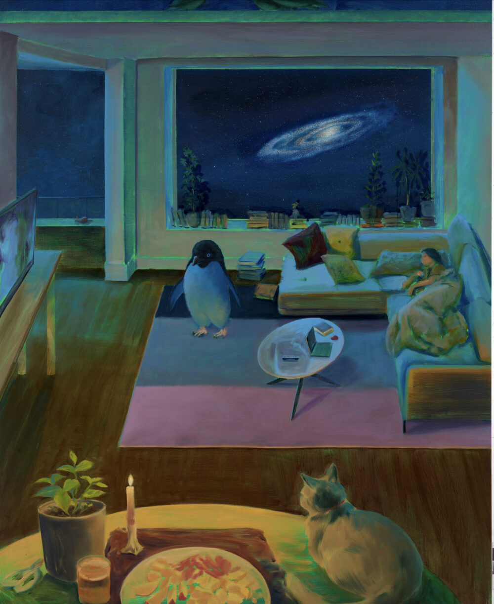 MC: The penguin in the painting isn’t a pet, but a wild animal intruding in someone’s home. I like to combine different elements to make environments feel both unusual and unfamiliar, like something out of our regular world. In this way, the penguin is my imagination distorting an existing reality, an ordinary person’s nap on a sofa. When it comes to penguins, I immediately think about the remote land I’ve never visited in the Antarctic. The icy cold landscape is so far away from where I live that it becomes strange and imposing. The penguin evokes all of that.