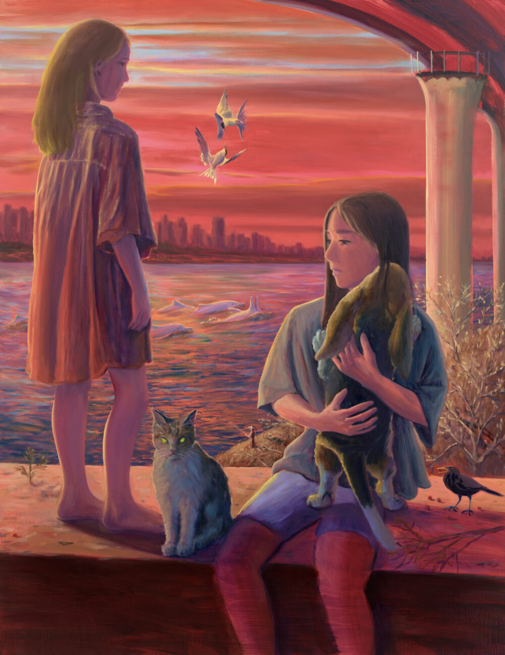 FM: Bridges (2024) depicts two girls – maybe ten or eleven years old – in front of the river beneath a red sky, accompanied by domestic animals as well as wild ones. Firstly, were animals an important part of your childhood and family life, and secondly, can you tell us about this painting and the significance of any elements or the narrative for you?