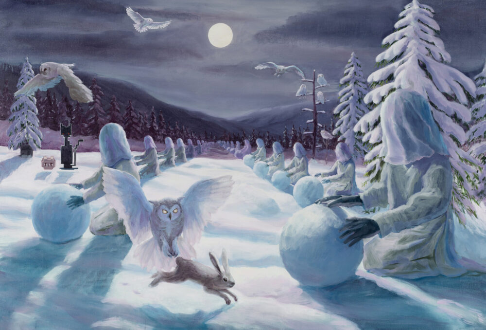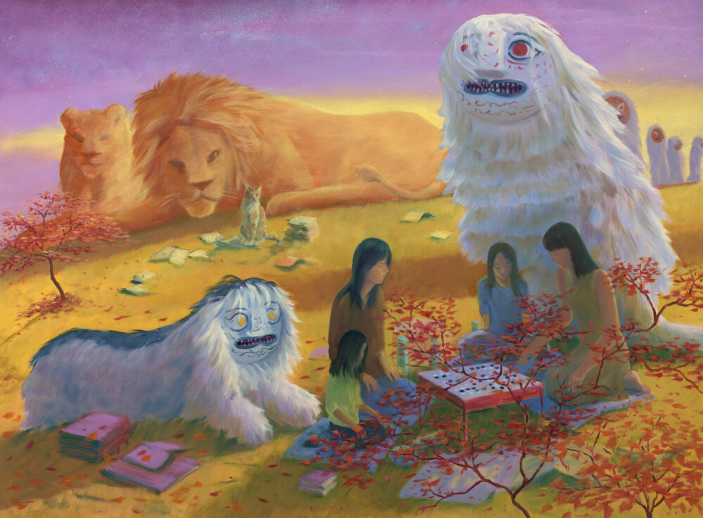 MC: In Visitors I’m depicting the lion mask and the costume as if they’ve become living beings instead of just people wearing them. The inspiration comes from the Korean folk Lion Dances called Bukcheong saja noreum and Bongsan Talchum. (These dances are staged plays where one or more masked people act as either an animal, another person or a supernatural being or god, delivering a message via dances or dialogues.) The ladies in front of them are playing Go, which I used to watch my brother play with his friends. In the painting, I wanted to paint women playing and maybe younger figures, learning from watching them.