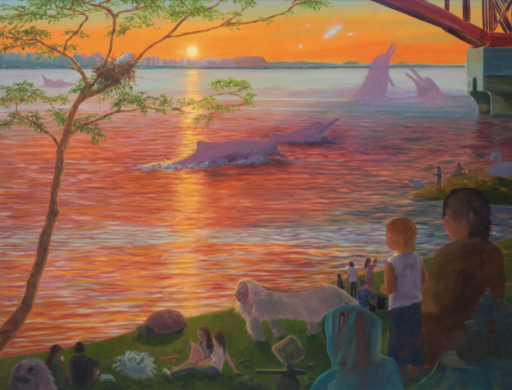 MC: The idea came to me while I was working on Bridges. A group of dolphins appeared in the middle of that painting, so in this sense the painting gave birth to another painting. I imagined dolphins swimming from the river back to the sea, growing larger as they move into a vast, freer environment. The painting also connects to Korea’s finless porpoise – native dolphins occasionally spotted in the Han River. It’s rare to see them, as they usually come from the sea and then return. The oldest recorded sighting dates to 1405, during King Taejong’s reign, making it a very rare occurrence, and it feels almost mythical. I wanted to depict the dolphins as majestic, imposing beings, in a scene bordering on the supernatural. I’m taking a very rare but natural occurrence and transforming it into an almost magical moment.