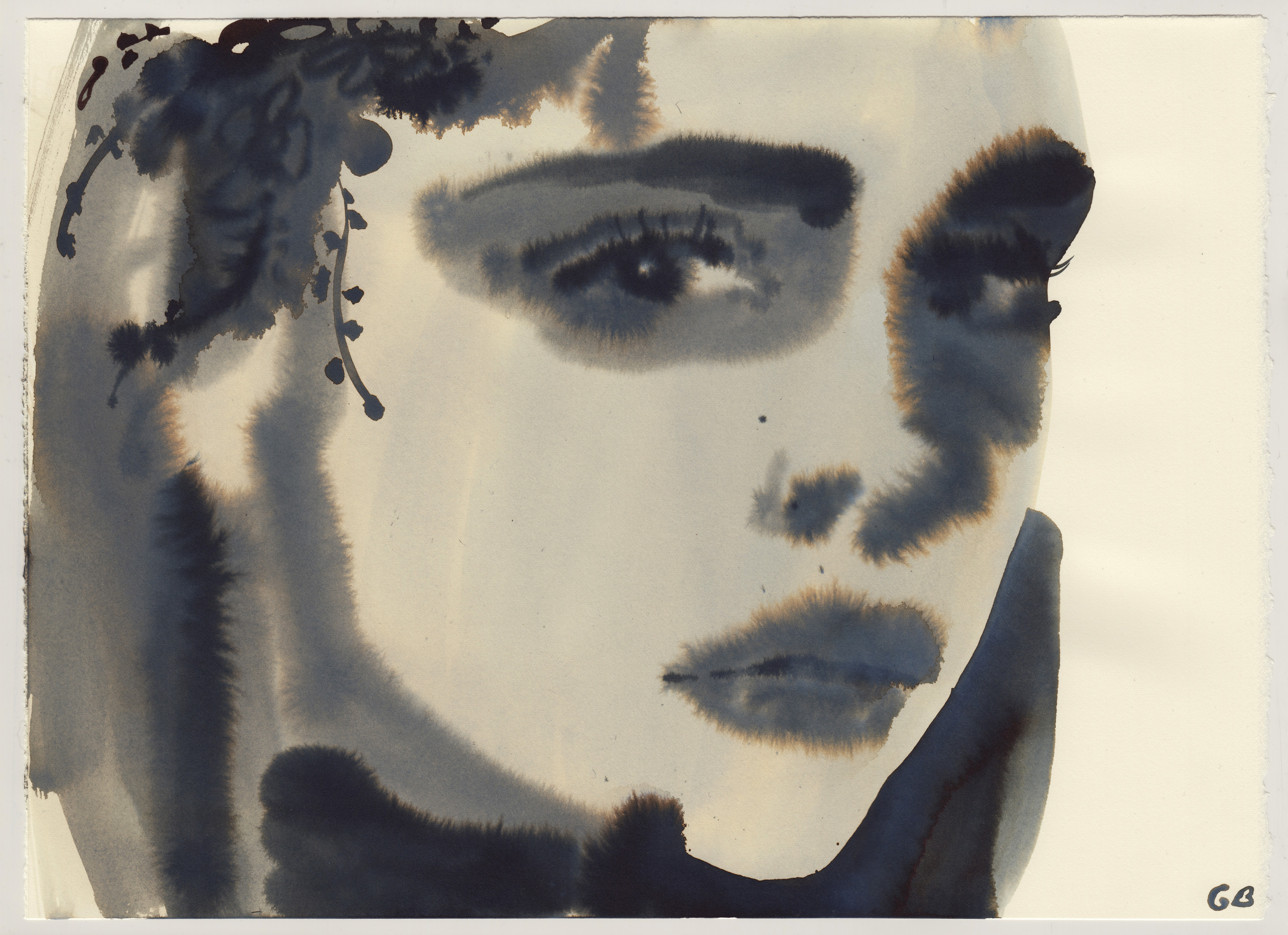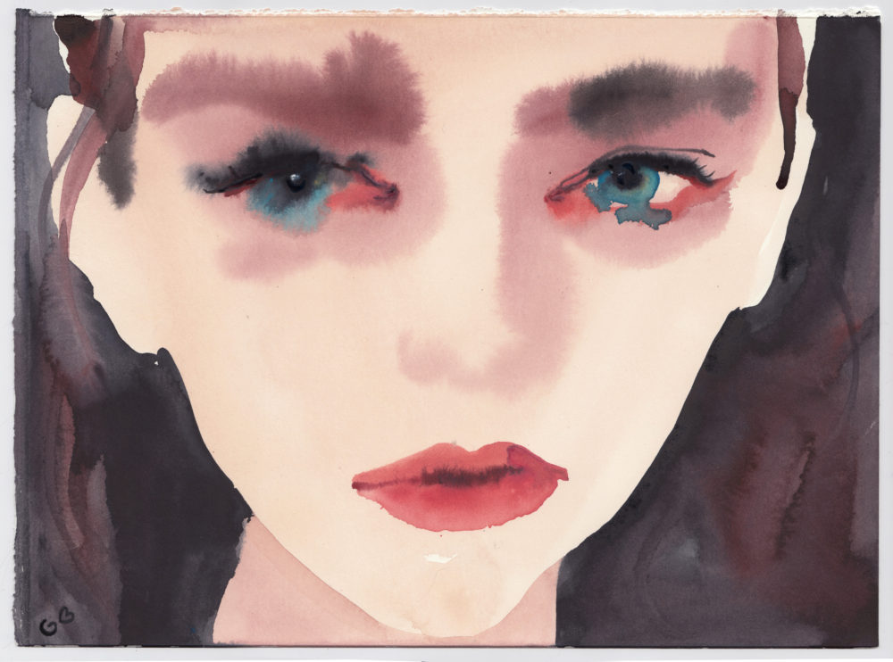 Gill Button became an Instagram sensation just a few months after joining the social media platform, leading to collaborations with Gucci and Dries van Noten and her work featuring in Vogue. In her gestural and spontaneous ink and watercolour paintings, she explores the relationship between outer image and inner character. Button’s portrait entitled Little Wing demonstrates Button’s fluid, painterly style, it is as though she has caught her subject off guard, in a distinct moment of time. Feelings of both fragility and transience are prevalent whilst Button’s use of colour in the deep pink of the lips and blue of the eyes set off the raw emotion of the painting. As an artist she often highlights her subjects features with makeup, whilst the soft lines and washes of muted colour contrast with the piercing stares of the compelling female subjects. The artist aims to capture not just a face, but portrays a strong presence and depth of character as her own emotions seep into her work leading the viewer to question, are we our own muse?