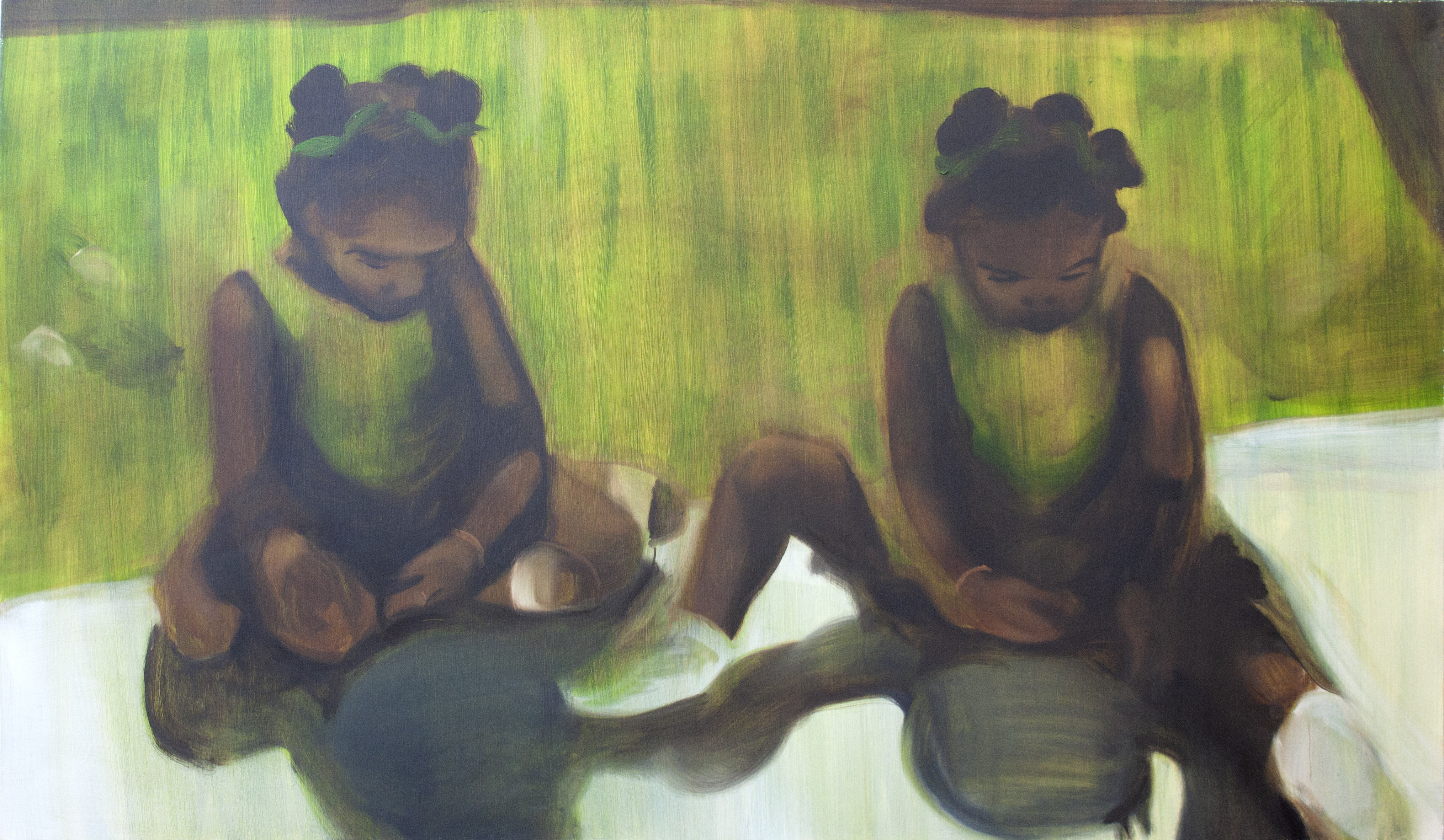 Both artists present dreamlike sometimes abstracted figures, engaging with varying sources of inspiration in everyday life. While Owen’s muses are intimate, often family and friends, Button finds her inspiration within the enigmatic faces of fashion models and film icons that flood the media, mostly working from secondary sources.