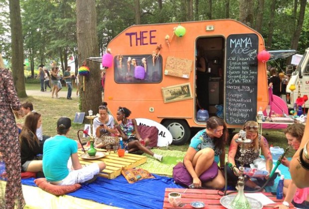 We are offered a slightly awkward cup of tea with a 7ft Geisha Boy. It’s an odd experience. He doesn’t say much. Equally odd is the intense-looking men walking around with wash basins strap around their shoulders to cleanse festival-goer’s hands.