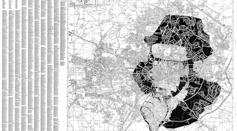 Coventry University graduate Michael Carr takes inspiration from the changing ways in which people listen to music, from the old days of record players to today’s virtual playlists. A Message to you Rudy is an inked silhouette of Lynval Golding from Ska band The Specials transposed onto a street map of Coventry. It neatly referencing the musical heritage of the Ska revival associated with the city and the wider West Midlands.