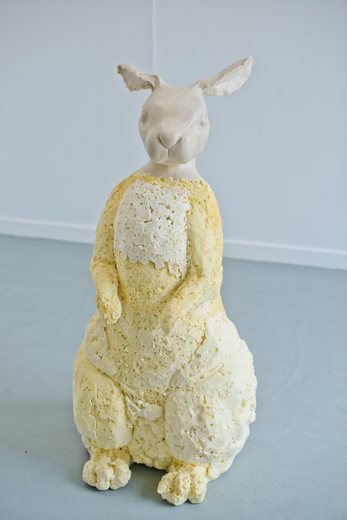 Lindy Brett’s installation Observations uses video and sound from the Lovell Radio Telescope at Jodrell Bank, whilst Susan Brisco’s video works examine plant intelligence and neuro-biology. Jade Hamilton’s uses glass biomes filled with plants in a comment on air pollution, whilst Lisa Nash’s sculpture of rabbits (pictured) are a comment on human relationships with animals. Milly Rowland’s prints depict an imagined marine world full of natural ecosystems and mutated forms.