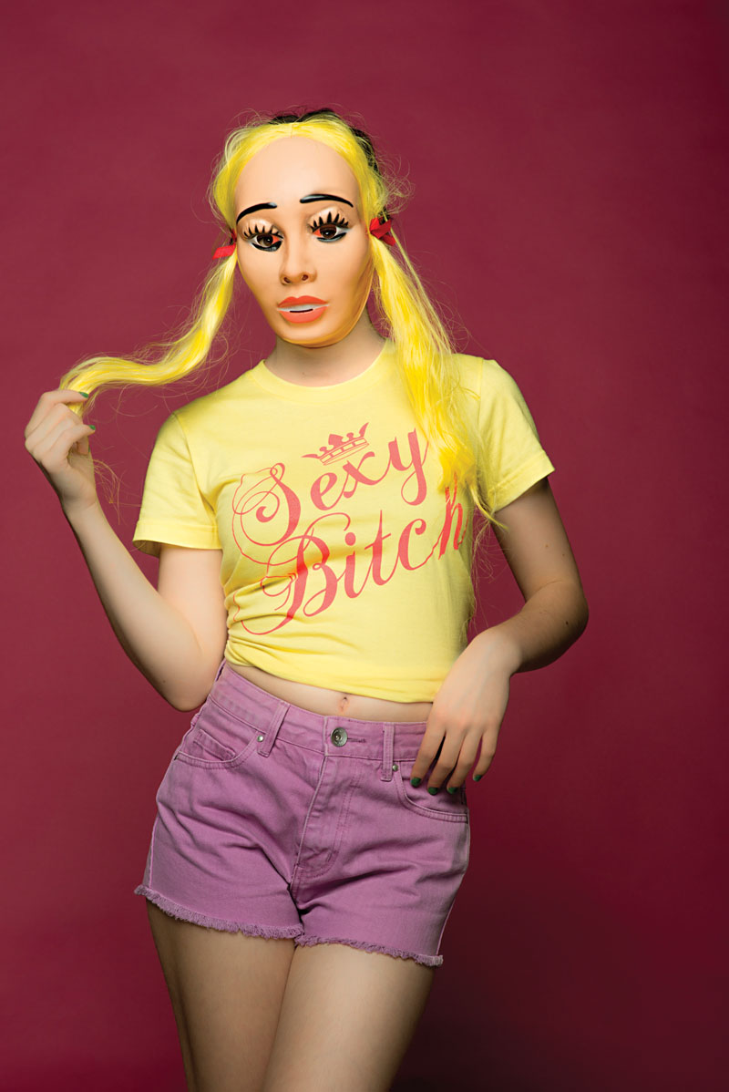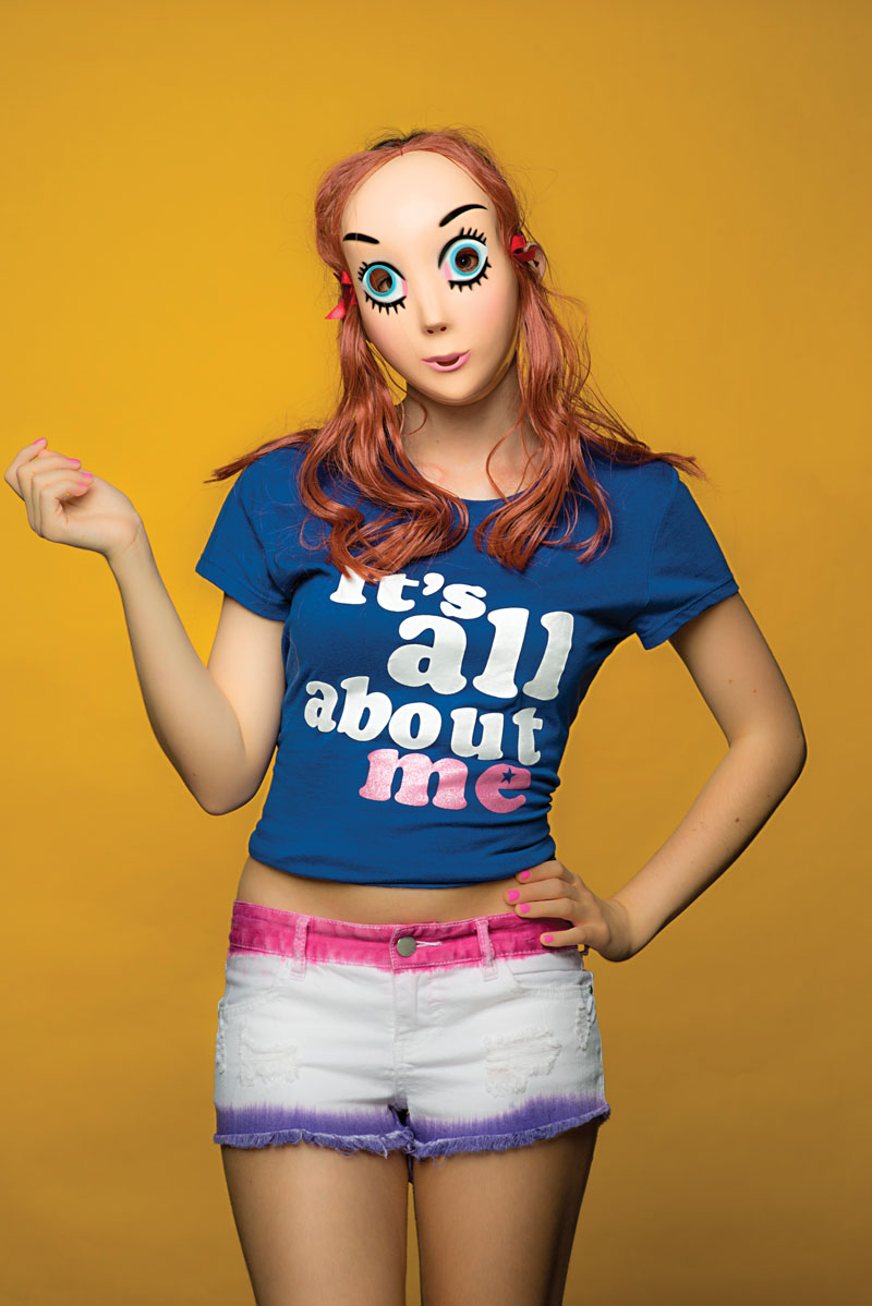 It was sparked by some writing that my daughter Olympia had done, while still a teenager in the local press. She described the pressures of social media to adopt a pout, to present a sexualised persona in order to score ‘likes’ on Facebook or Instagram. Olympia’s case was subtle because she had equal suspicion for the adult crackdown on sexting and other promiscuous media practices that she felt actually did nobody any great harm unless adults get involved. So I thought that I’d investigate the brash and brazen world that seems to be so full of ironies. I discovered online that there were commercially available T-shirts declaring a provocative in-your-face attitude which, however, cannot be taken literally. And in the end, the very title “it’s all about me” is ambiguous, because it could mean all about the model, Olympia, or all about the artist, me.