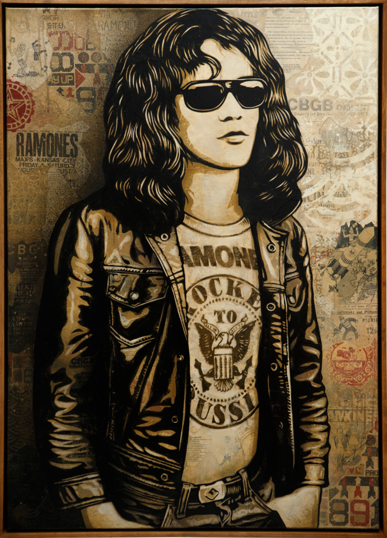 Most of his work starts out as an illustration done by hand and then this is scanned into a computer from where he can start to construct the images using a combination of stencils and collaged backgrounds. “Whatever it takes to make the piece authentic,” he explains. Fairey has his own screenprinting press on which he makes his smaller works but he uses a printer to do the larger pieces (the same guy that Banksy used for his show in Los Angeles last year).