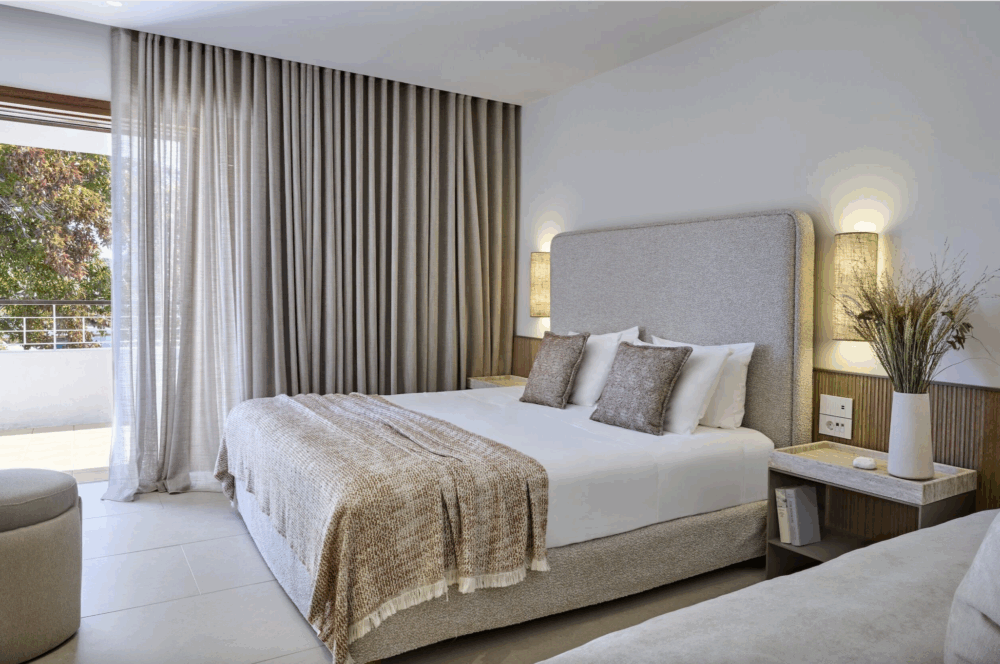 A select number of rooms have emerged fully transformed as Signature Double Sea View Rooms. Situated elegantly on the second and third floors, these newly refurbished 32-square-metre spaces blend contemporary comfort and island charm with understated luxury. They feature calming earthy neutrals, soft textures, and refined wooden touches that echo the natural beauty of Skiathos itself. Thoughtfully designed balconies capture spectacular views over the shimmering Aegean, ensuring guests feel continuously connected to the island’s captivating seascapes. Accommodating two adults and a child comfortably, these refreshed spaces offer guests an inviting retreat that epitomises relaxed sophistication.