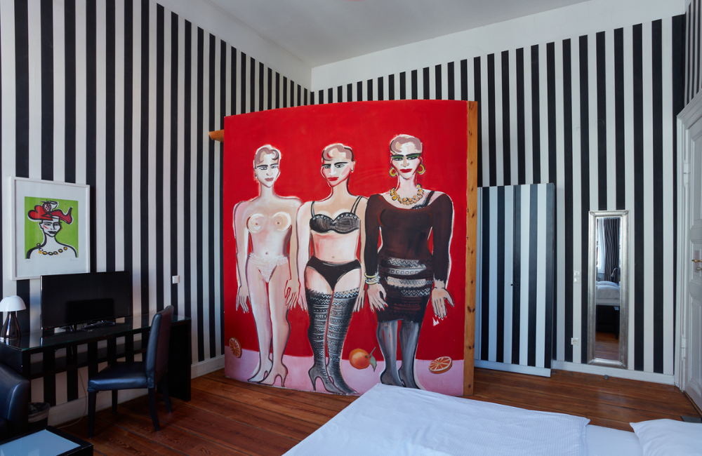 Berlin again — because of course. At the Arte Luise Kunsthotel, each room is given over to a different contemporary artist. Some are whimsical, others political, a few downright unsettling. One room has clouds painted floor to ceiling; another looks like a minimalist prison cell.