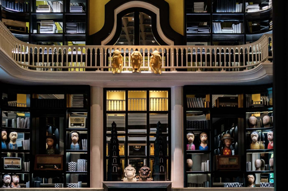 What makes InterContinental Danang so unforgettable is the sheer abundance of creative details at every turn. Bensley infused the resort with Vietnamese culture and folklore, then filtered it through his quirky lens. Traditional vernacular architecture elements – like pagoda-style roofs and ancient temple-inspired columns – are reinterpreted in bold black-and-white pavilions and gazebo structures scattered on the hillside. The reception building resembles a grand Vietnamese hall with a lofty ceiling and timber latticework, but on closer look, you’ll spot modern art pieces and a gigantic mural of a monkey in regal attire. In fact, a cheeky monkey motif runs throughout the resort, a nod to the peninsula’s resident monkey population and a vehicle for Bensley’s fun. One bar, called M Club, is designed as if by an “aristocratic monkey” – it even has an 85-seat private cinema painted banana-yellow and lit by banana-shaped sconces on the walls. (It’s delightfully absurd, in the best way.) At the fine dining restaurant, a colony of golden monkey statues clamber up the columns. Guests riding the hillside tram will notice each carriage has its own monkey mascot hood ornament, hand-sculpted and painted. This playful theme earned Danang the reputation for having “the most exciting toilets in the world,” as Bensley turned even the washrooms into fanciful spaces with monkey wall art and tongue-in-cheek details.