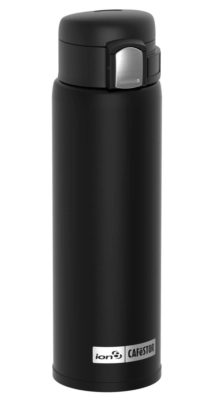 A stylish leak proof travel mug, vacuum insulated stainless steel for hot drinks with a handy hygienic cover that flips open with one hand and locks closed for safety.