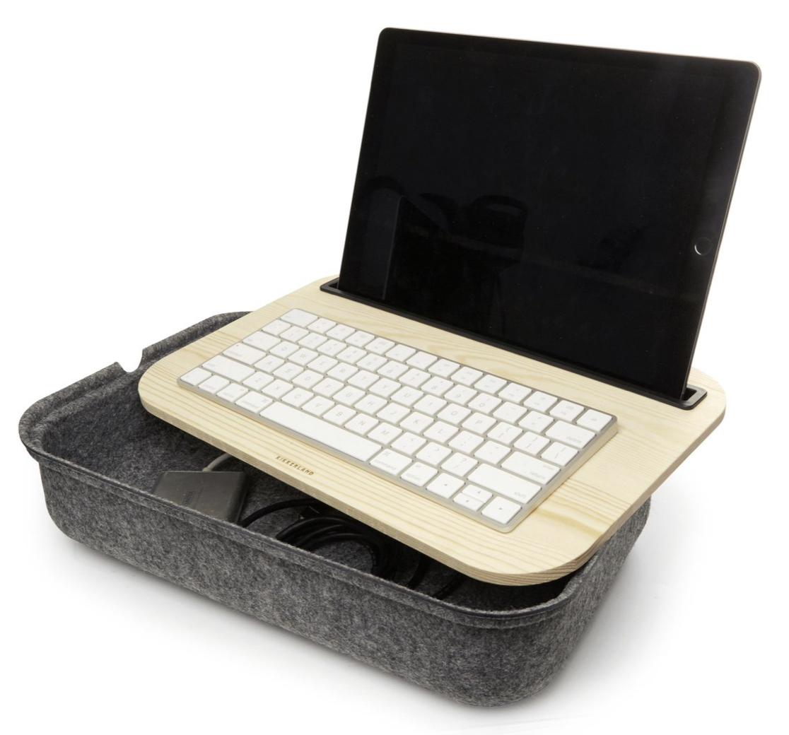 The felt iBed Storage is a simple, easy organization solution. It features a storage compartment covered in dark grey felt and a removable wood lid to make it an all-in-one work or play station that conveniently organizes pens, papers, notebooks, cords, and anything you need for work or entertainment for easy access wherever you are.