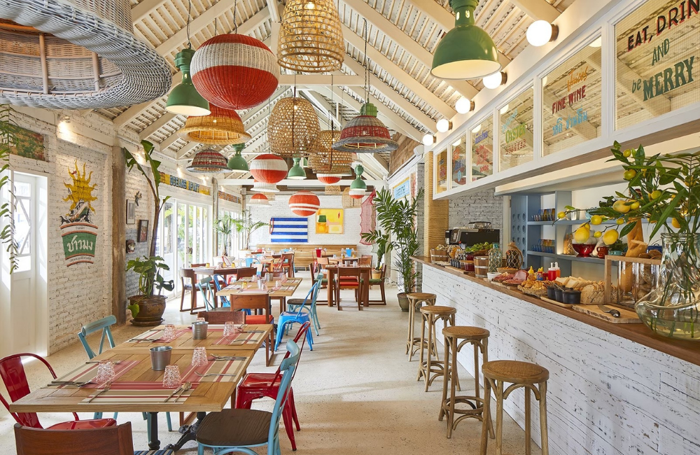The Peri isn’t flashy, and that’s precisely the appeal. Its blue-and-white colour palette nods to Thailand’s maritime past, while rustic wooden accents and clean, airy spaces evoke the ease of a beachside retreat. Rooms are stylish but unfussy—light woods, woven textures, crisp linens. They’re designed for lingering—mornings spent reading on the terrace, afternoons where time slows with a cold drink in hand.