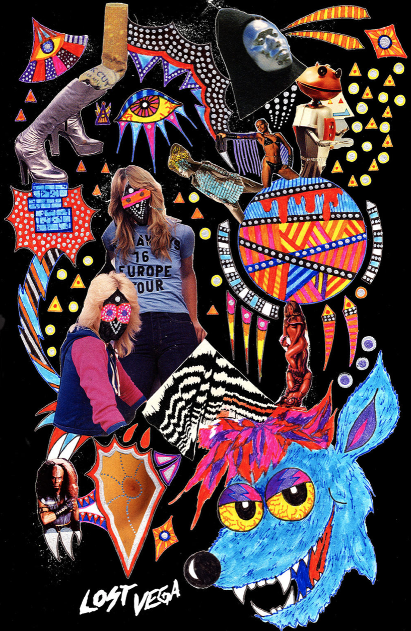 First lots of black coffee and cigarettes… Inspiration itself is the easy part, realization is more like a constant positive battle with myself. A rewarding struggle but it also should be good fun. For the drawings I use crayons mostly, sometimes ink and feather. When I make collages I use whatever I find, from old magazines to safety pins, cigarette burns or nail polish.