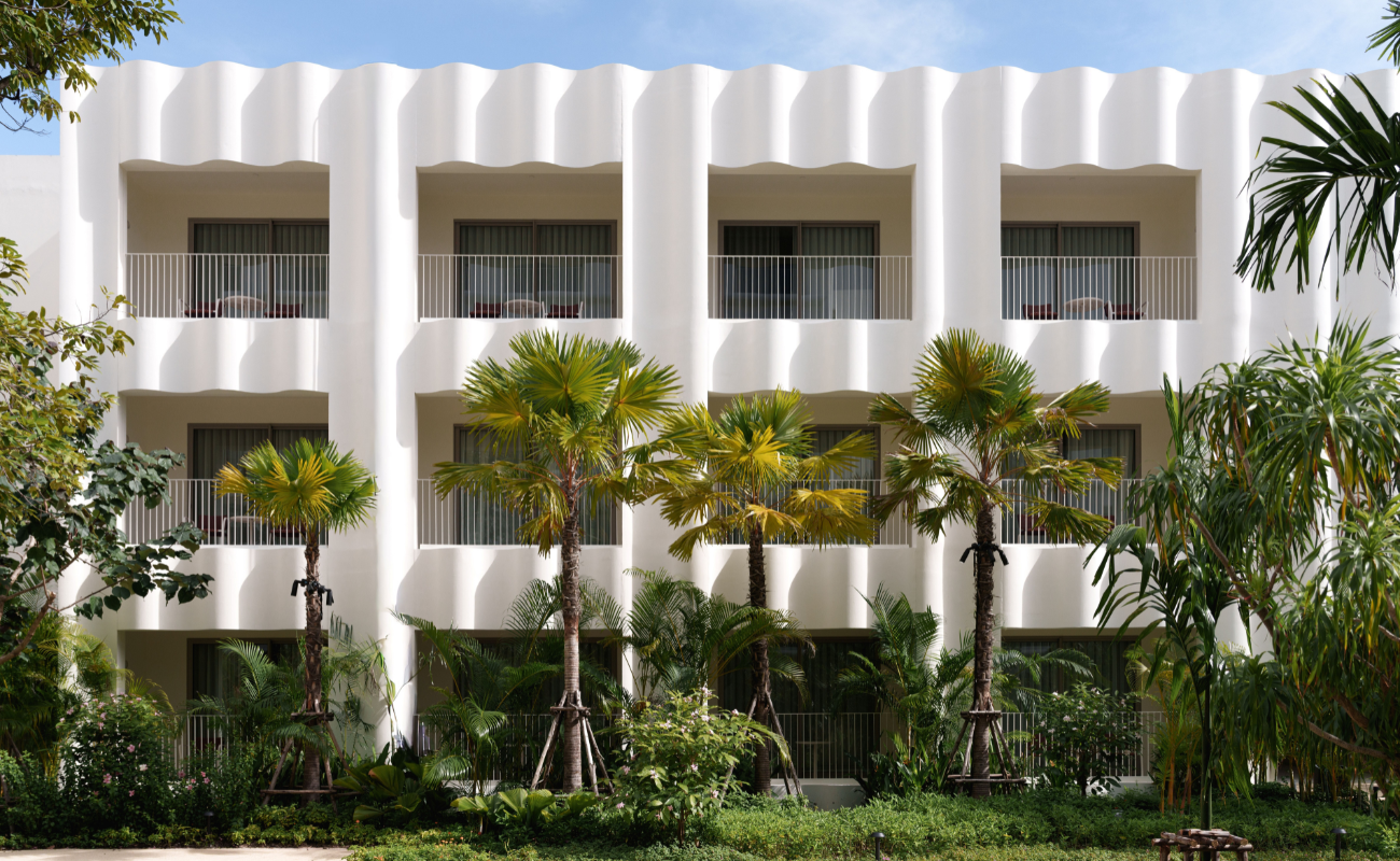 The first thing that hits you is the form. Designed by Bangkok-based ONION, who also shaped the sister property in Hua Hin, the hotel leans into a softened modernism, with traces of Brutalism stripped back to something lighter. White, sculptural walls ripple across the site, catching the sun in ways that shift throughout the day.