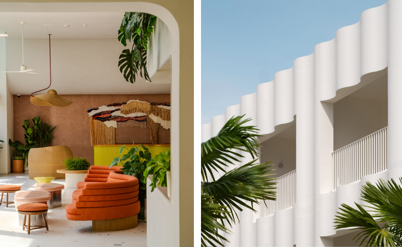 Sunset Orange and Mud Green appear throughout, not as dominant statements but as subtle punctuation against an otherwise pale, chalky palette. Rounded furniture echoes the building’s exterior language, while unexpected details, a lip-shaped light, a mural, and an object that feels closer to art than décor stop the space from drifting into restraint.