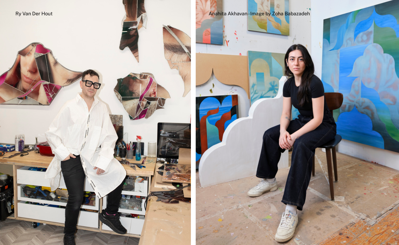 Anahita Akhavan explores the intersection of Islamic art, architecture and cultural identity through intricate, geometric abstractions that speak to migration and belonging. Ry Van Der Hout works with glass and mirrors to examine transformation, using fragmentation as a metaphor for queer experience and becoming.
