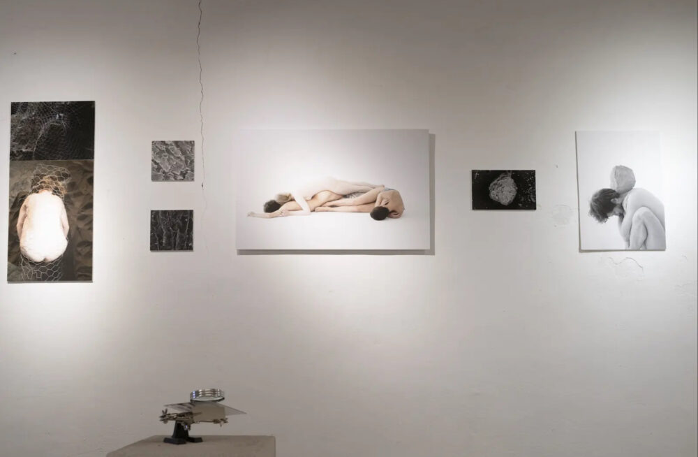 Layering was another recurring theme. One installation featured photographs of human figures arranged in layers that mimicked geological strata, reflecting how memory and time accumulate in both human and geological contexts. I also used mesh or netting as a visual motif. For example, one photograph showed a rock wrapped in industrial mesh, while another depicted a human body similarly encased. This was a way to explore themes of containment, protection, and the parallels between organic and inorganic forms.