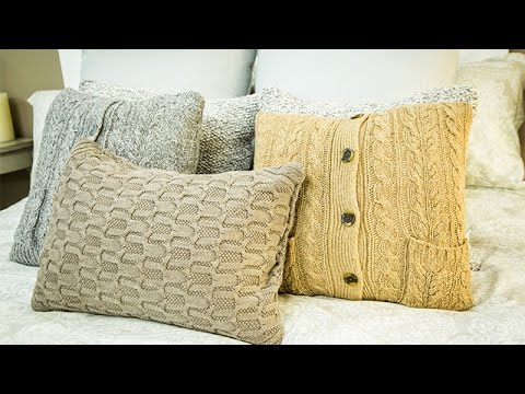 Create a cushion, by using an old knit sweater, by cutting off the body of the knit sweater, turn inside out, and sew along the top and bottom openings, leaving an opening for the stuffing. Use neutral tones, or mix and match colours, depending on your preference or overall colour scheme.