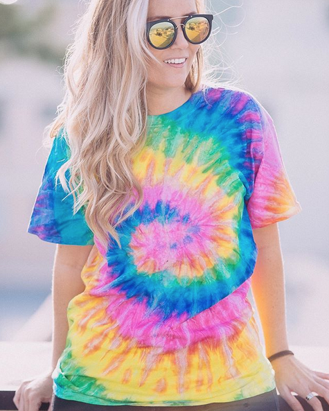 Create colourful tie-dye designs for a t-shirt. Try out different tie-dye techniques, using 2 or more colours. Grab an old white t-shirt, and a tie-dye kit, which you can buy from craft shops, and get creative with pattern designs. Wear the t-shirt loosely, or try tying a knot at the front, side or back, for a new style. (see https://www.instagram.com/colortone_usa/ for inspiration)