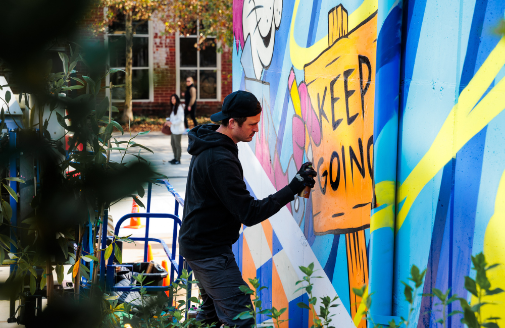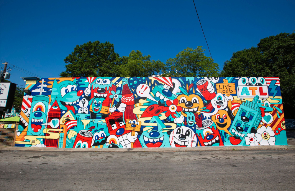 Born and raised in Connecticut, Greg Mike’s creative journey began with childhood trips to New York City, where the vibrant street art scene opened his eyes to the transformative potential of public spaces. The city’s dynamic mix of graffiti and murals left an indelible impression on him, sparking a fascination that would later merge with his passion for mid-century cartoon characters. Today, Greg is a pivotal force in Atlanta’s contemporary art scene, where his gleefully twisted characters and electric colours adorn walls from Miami to the Swiss Alps, with Atlanta as his primary canvas.