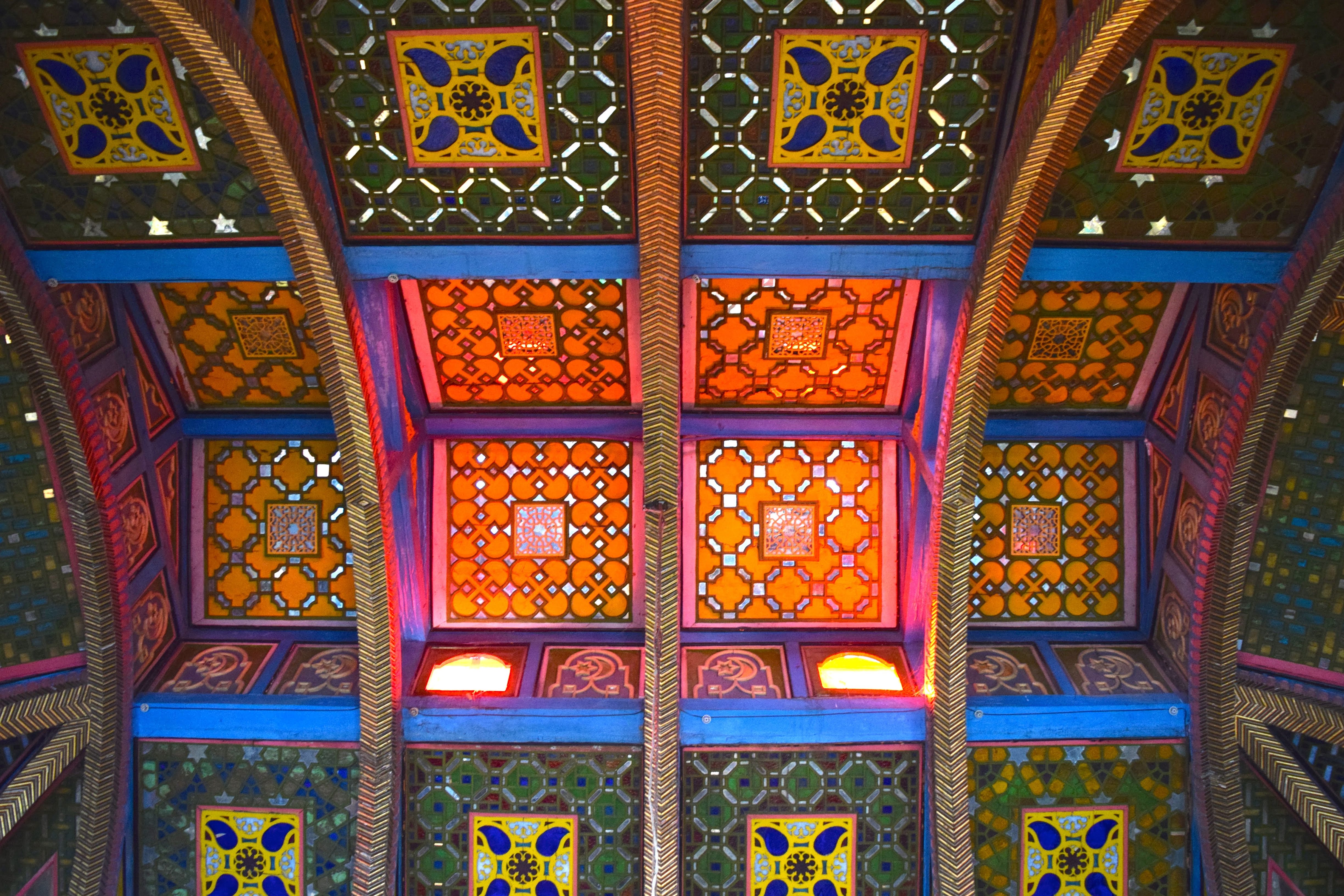 The main courtyard is dominated by two buildings: the turquoise wooden verandas of historic Uzbekistan, and the white stucco Russian palace. Wandering the grounds you’ll also find the harem, orchards, and reflection pools. There are some pretty epic painted ceilings and stained glass indoors.